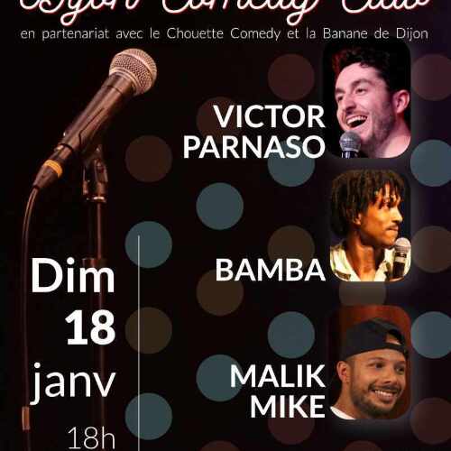 - Victor Parnaso (Dijon/Paris) Victor c'est le stand-upper par excellence : il monte sur scène et, sans que tu t'en rendes comptes, en 10 minutes c'est ton pote. Il a une facilité déconcertante à décortiquer le quotidien pour te prouver à quel point c'est pas normal d'aller boire un verre avec ses collègues mais ça l'est d'avoir un chien qui s'appelle Thierry. Victor, c'est un Dijonnais d'origine, qui aujourd'hui joue avec les grands à la capitale. C'est plusieurs passages TV remarqués, et des 1ères parties d'artistes notoires à travers toute la France.